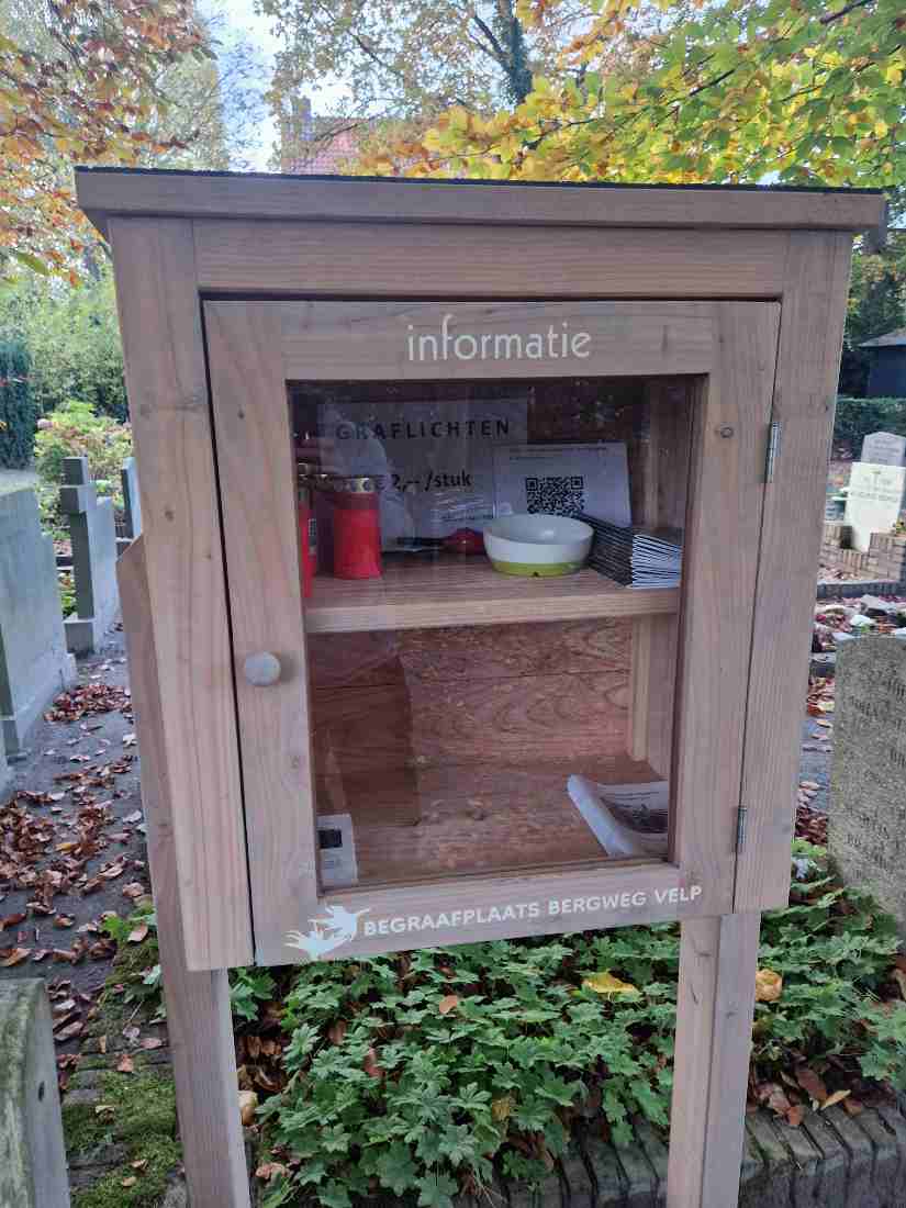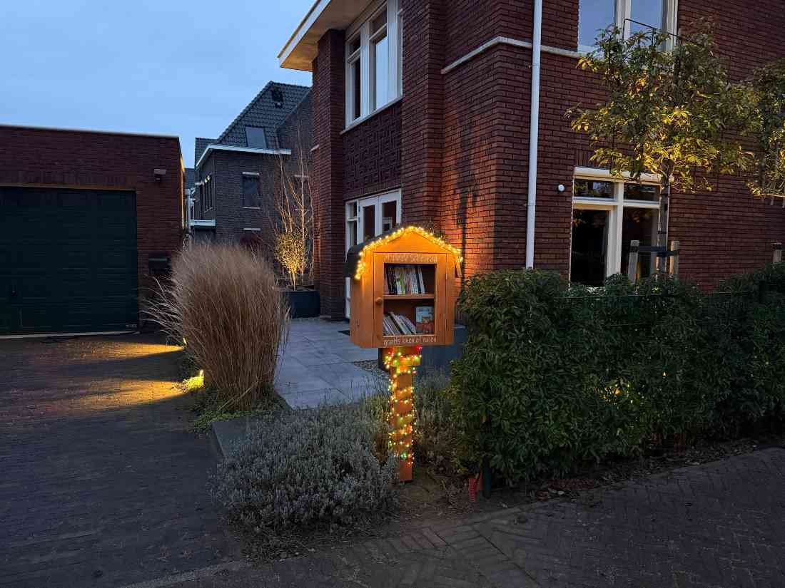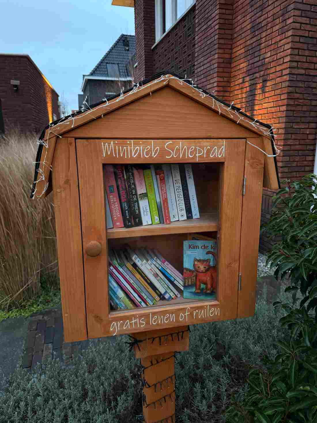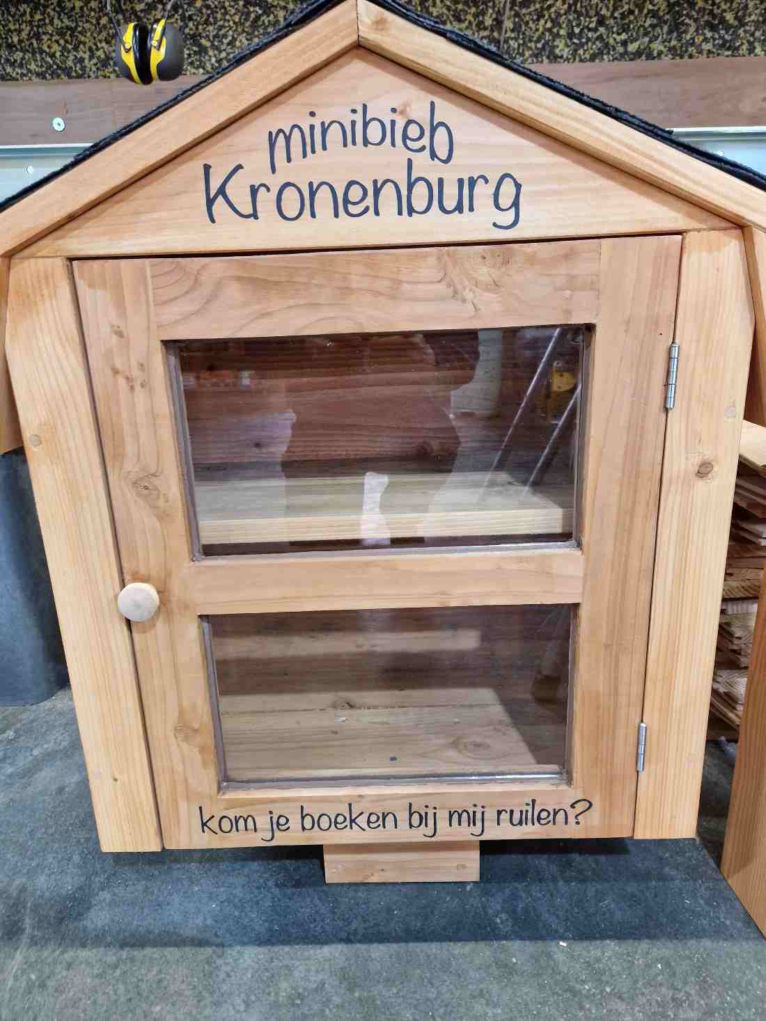 Minibieb zoals afgebeeld heeft een afmeting van ongeveer 60 cm breed, 70 cm hoog en 31 cm diep. Hierdoor is er gelegenheid voor twee rijen boeken en kunnen er zo’n 40 boeken in van gemiddelde dikte.