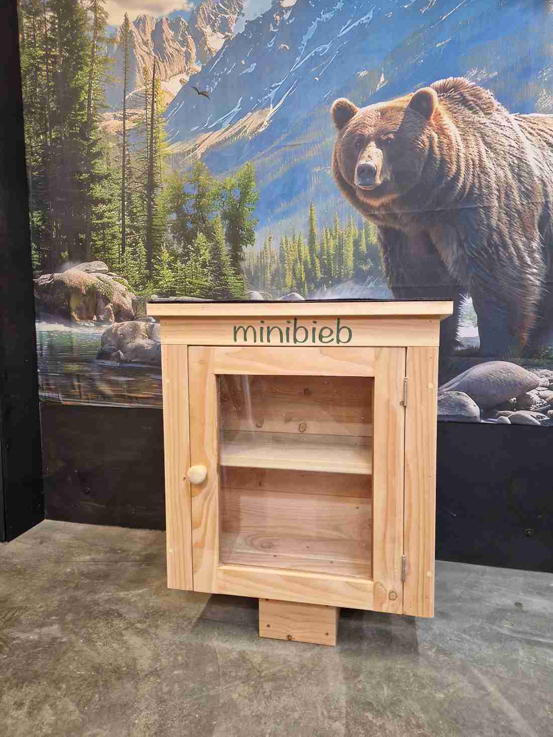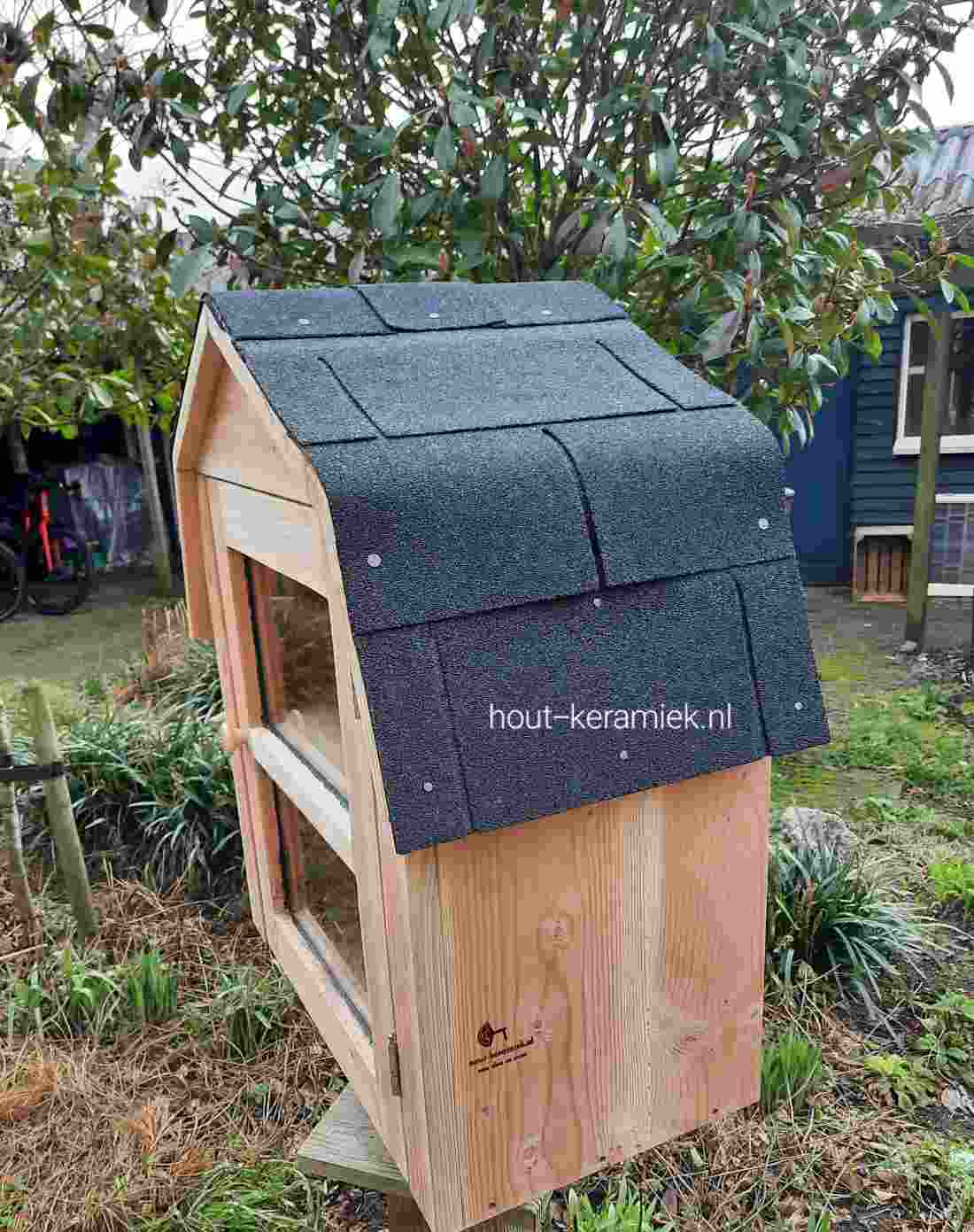 Minibieb gemaakt van duurzaam douglas hout, model “mansarde” (ook wel gebroken of Franse kap genoemd) of schuin/plat dak of ander type op in overleg te leveren.