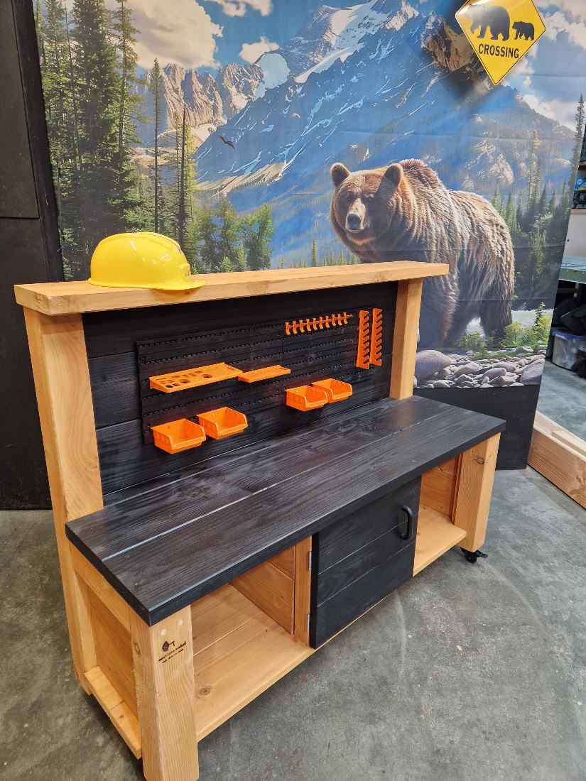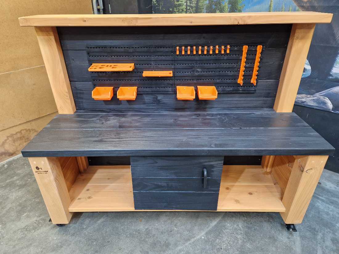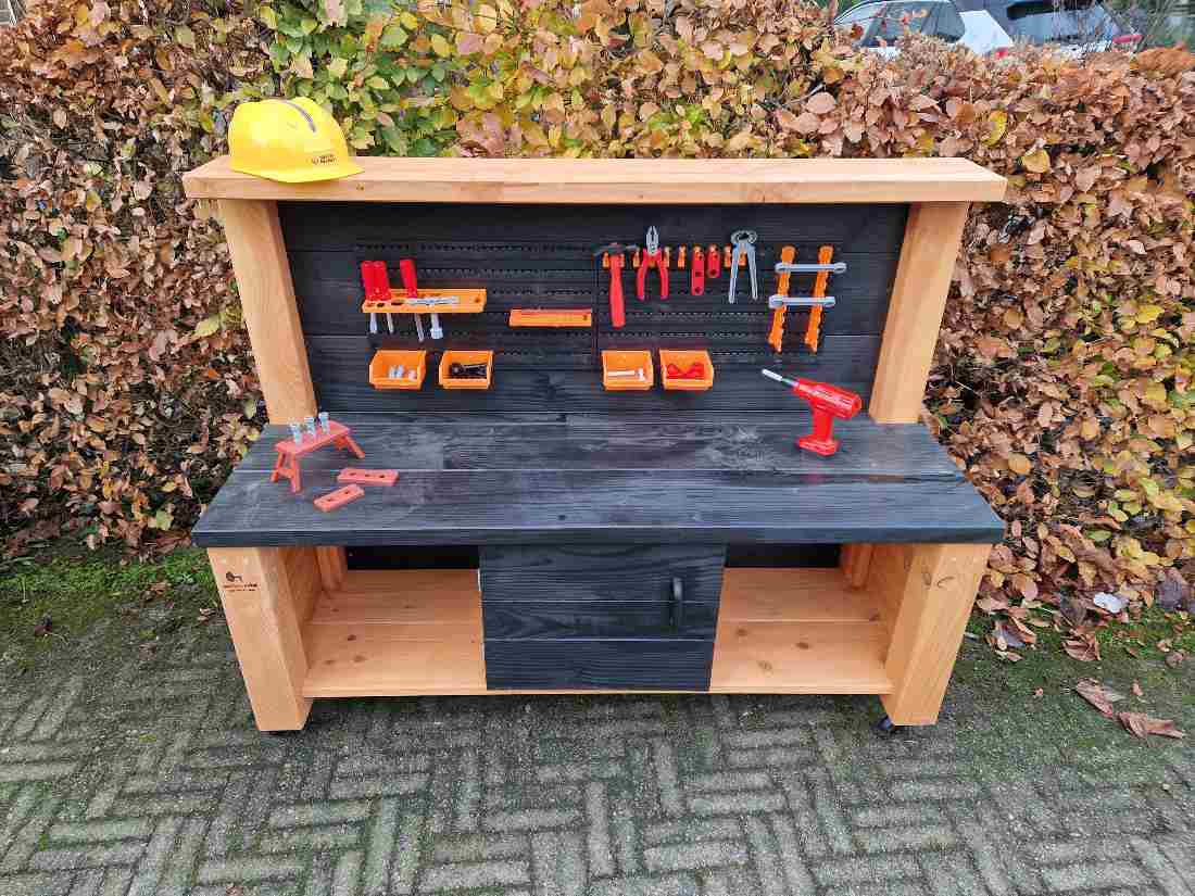 Standaard wordt de werkbank behandeld met tuinhoutolie (aqua eco) in de kleuren Douglaslook met zwarte achterwand en zwart werkblad. De achterwand wordt voorzien van een gereedschapsbord met toebehoren, zodat (kinder)gereedschap mooi kan worden opgeborgen (zoals het hoort). De overige accessoires zijn niet inbegrepen. (bij de bekende retailers kun je deze voor een prikkie halen). Kleuren kunnen in overleg zonder meerprijs worden gewijzigd.